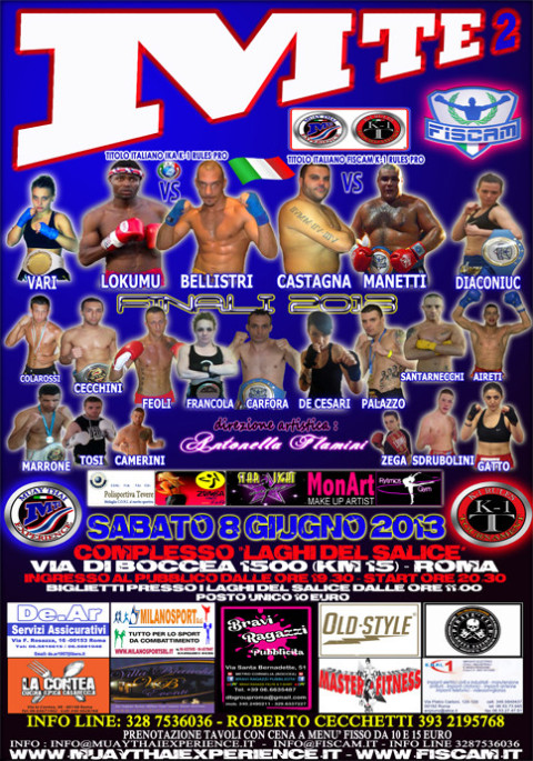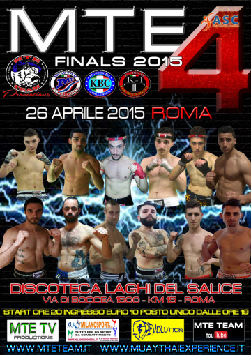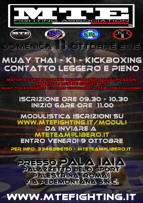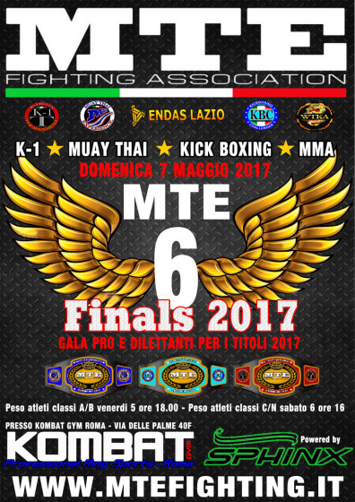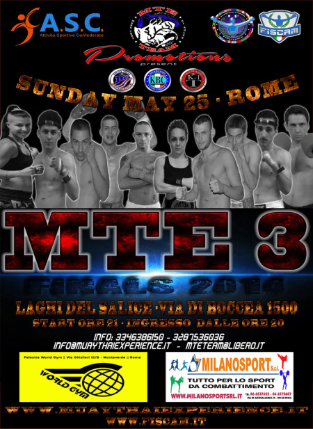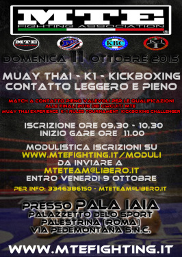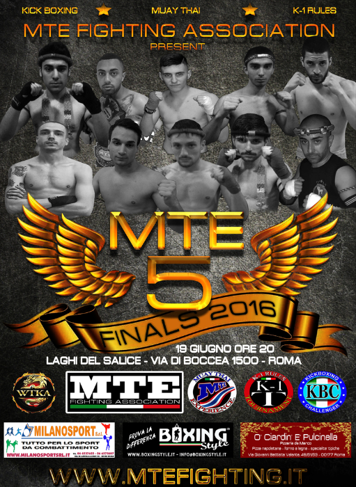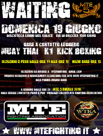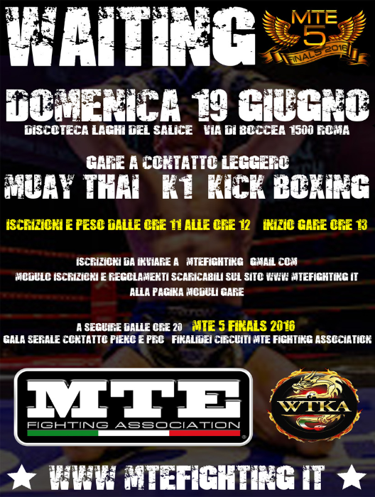 Domenica 19 Giugno 2016 si svolgeranno a Roma le finali dei circuiti Nazionali della MTE Fighting Association, ovvero il "MUAY THAI EXPERIENCE", il "K-1 RULES TOURNAMENT" ed il "KICK BOXING CHALLENGER" .