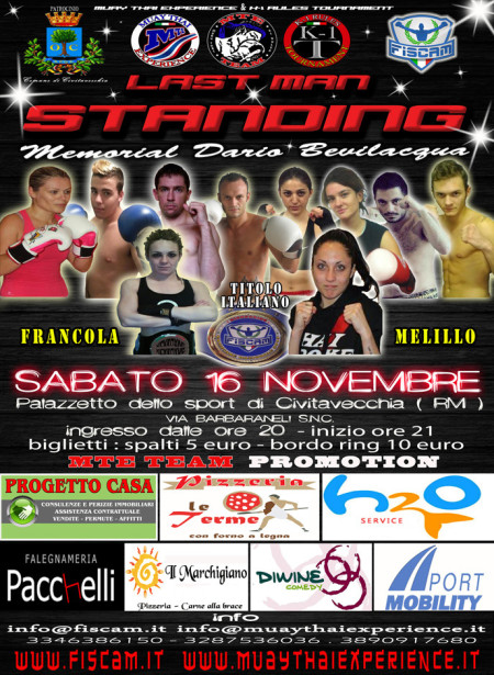 Inizia alla grande la stagione 2013/14 con il primo evento valido per le qualificazioni alle finali 2014 con l'evento "LAST MAN STANDING" che si svolgera' Sabato 16 Novembre presso il palazzetto dello sport di Civitavecchia (ROMA) dedicato all'amico DARIO BEVILACQUA.