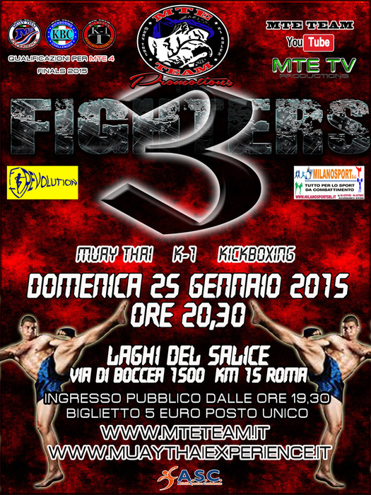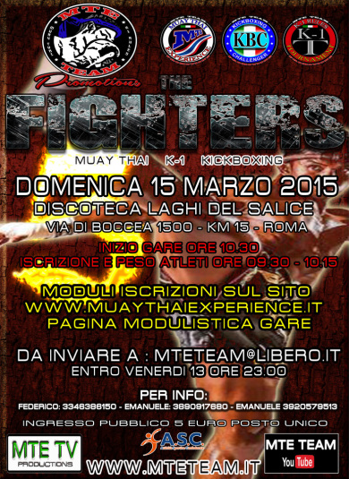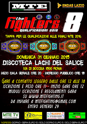 Domenica 31 Gennaio presso i Laghi del Salice (Roma Via di Boccea 1500) si svolgera il gala serale THE FIGHTERS 8 valido come prima tappa di qualificazione alle finali dei circuiti MTE per la stagione 2015/16.