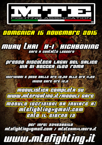 Domenica 15 Novembre presso la Discoteca LAGHI DEL SALICE si scvolgeranno competizioni a CONTATTO LEGGERO per le disciline MUAY THAI K1 KICK BOXING M.M.A. organizzate da MTE FIGHTING ASSOCIATION.