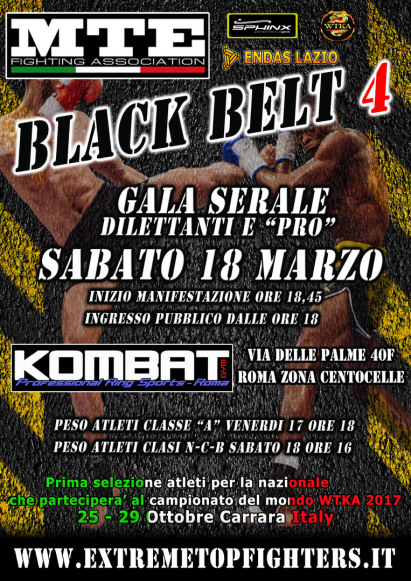 Si e' svolta a Roma in data 18 marzo 2017 la quarta edizione della saga Black Belt patrocinata e organizzata da MTE FUGHTING ASSOCIATION. Numerossissime le partecipazioni allo splendido Gala serale svoltosi presso la struttura KOMBAT GYM ROMA , Tutte le immagini sono visibili ala pagina Photogallery